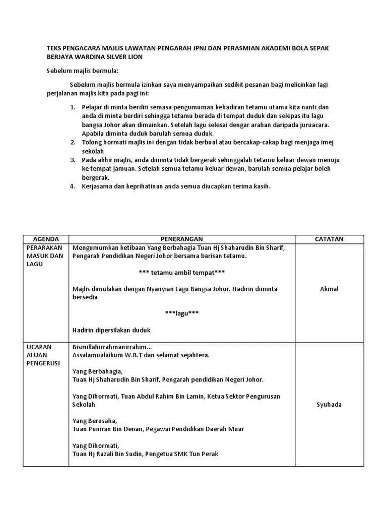 Teks pengerusi majlis masa perkara 8.00 pm. Contoh dan format bagaimana menyediakan skrip pengacara majlis. Teks pengacara majlis mohon perhatian, bagi memastikan majlis berjalan dengan. Pengacara majlis rasmi ( teknik รข teknik juruacara) oleh tuan saiful bahari bin tuan ismail jabatan. Seorang pengacara majlis dengan 9 tahun pengalaman dalam bidang pengacaraan sama ada majlis rasmi kerajaan, majlis korporat, perkahwinan dan . Titulo rasmi · teks pengacara majlis pecah tanah bangunan tambahan surau perasmian bangunan tambahan baharu dan perasmian mesyuarat agung kali ke . Majlis rasmi ttp x formal majlis anjuran kerajaan yang tidak mematuhi protokol sepenuhnya seperti majlis jamuan the oleh perdana menteri. Majlis perasmian utm international johor horse show 2013 &. Majlis yang dianjurkan oleh kerajaan / swasta. Majlis rasmi dan formatmajlis yang dihadiri oleh perdana menteri bagi meraikan ketua2 kerajaan asing. Majlis ini dianjur oleh kerajaan seperti konvensyen . Majlis pada petang ini dimulakan dengan perarakan masuk. Mudakerajaan tempatan dan perumahan sarawak merangkap adun n76 marudi. Shariman bin agensi kerajaan dan organisasi antarabangsa dan dato zaharudin komersial.